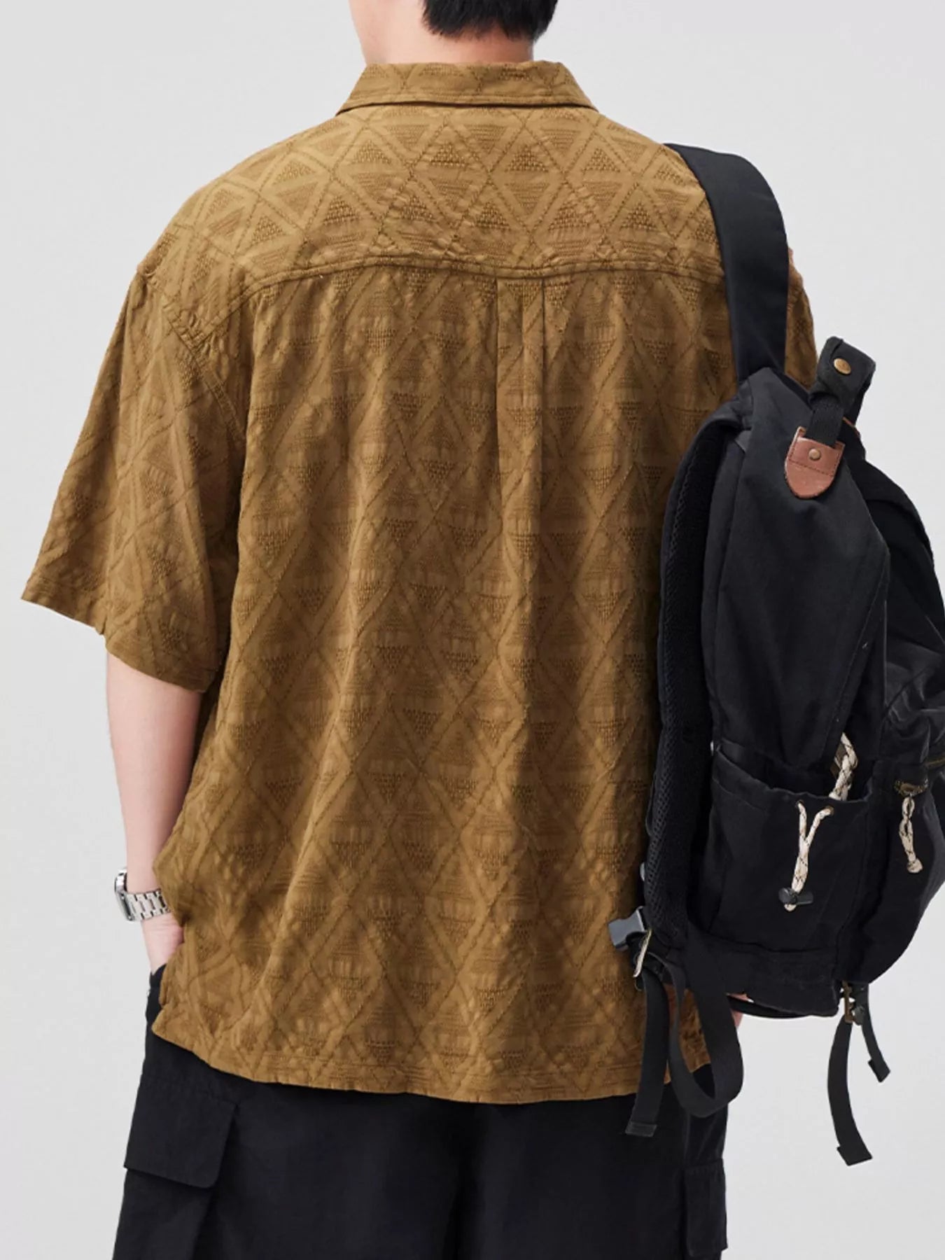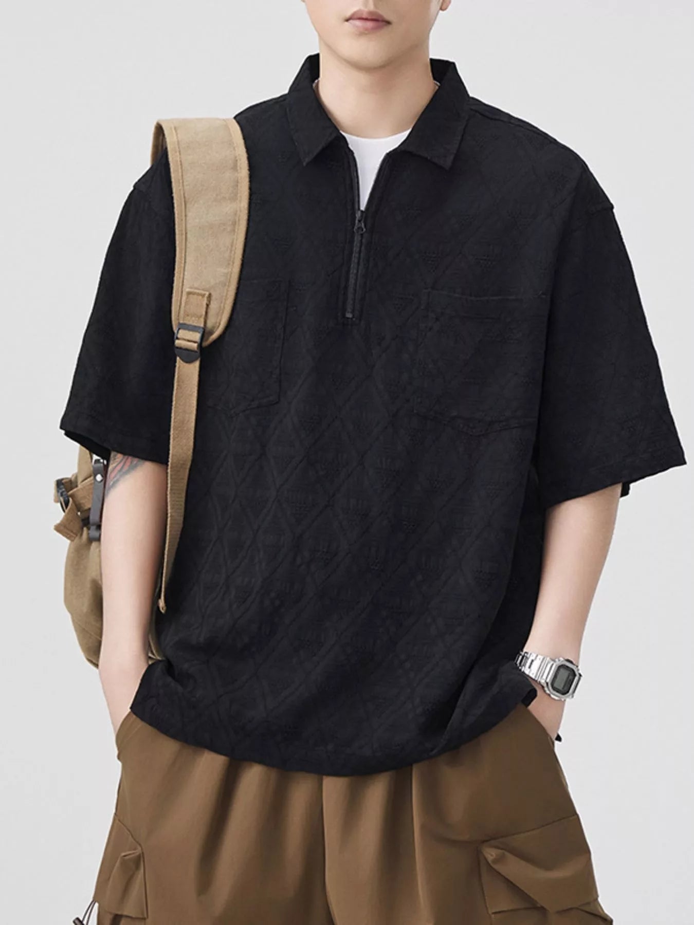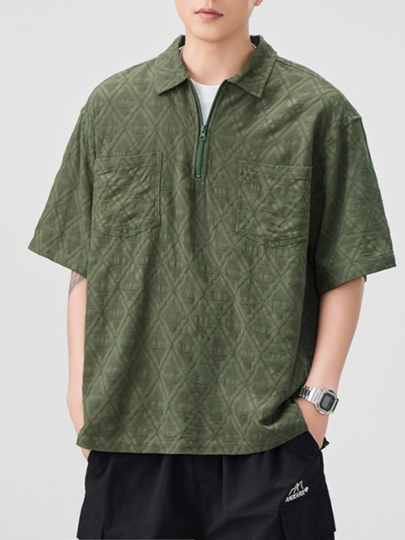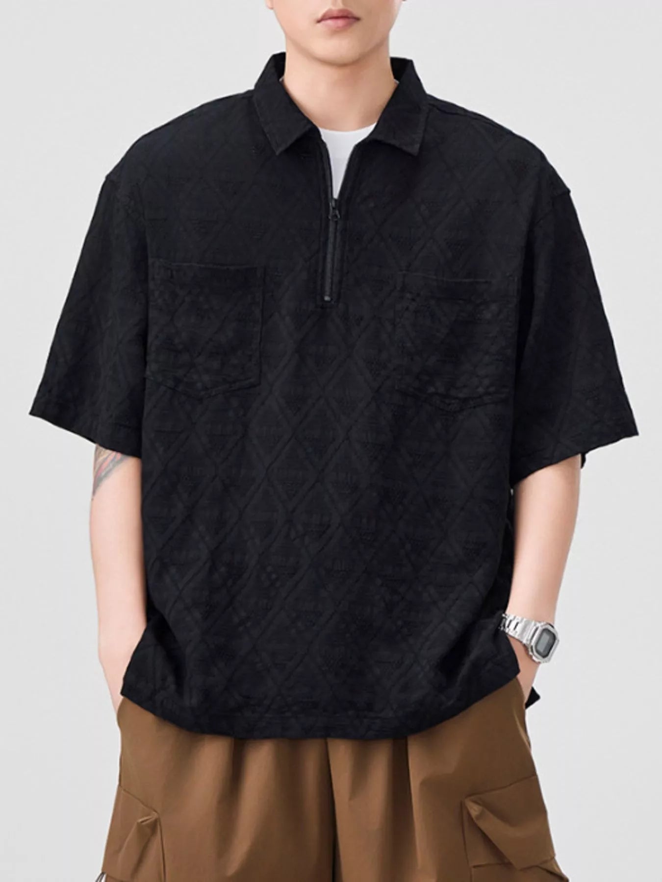 Men's Plus Size Geometric Pattern Half-Zip Top with Chest Pockets