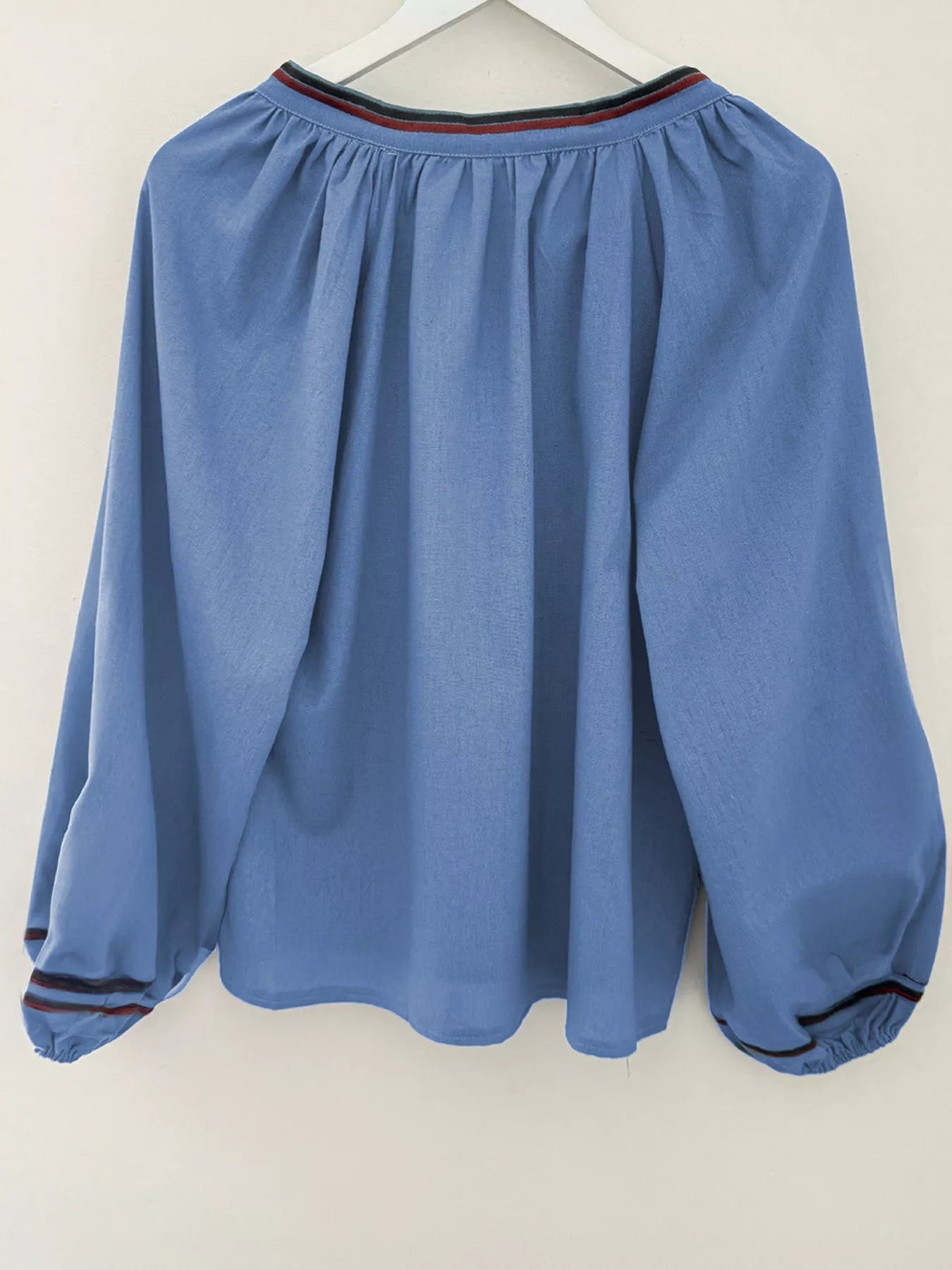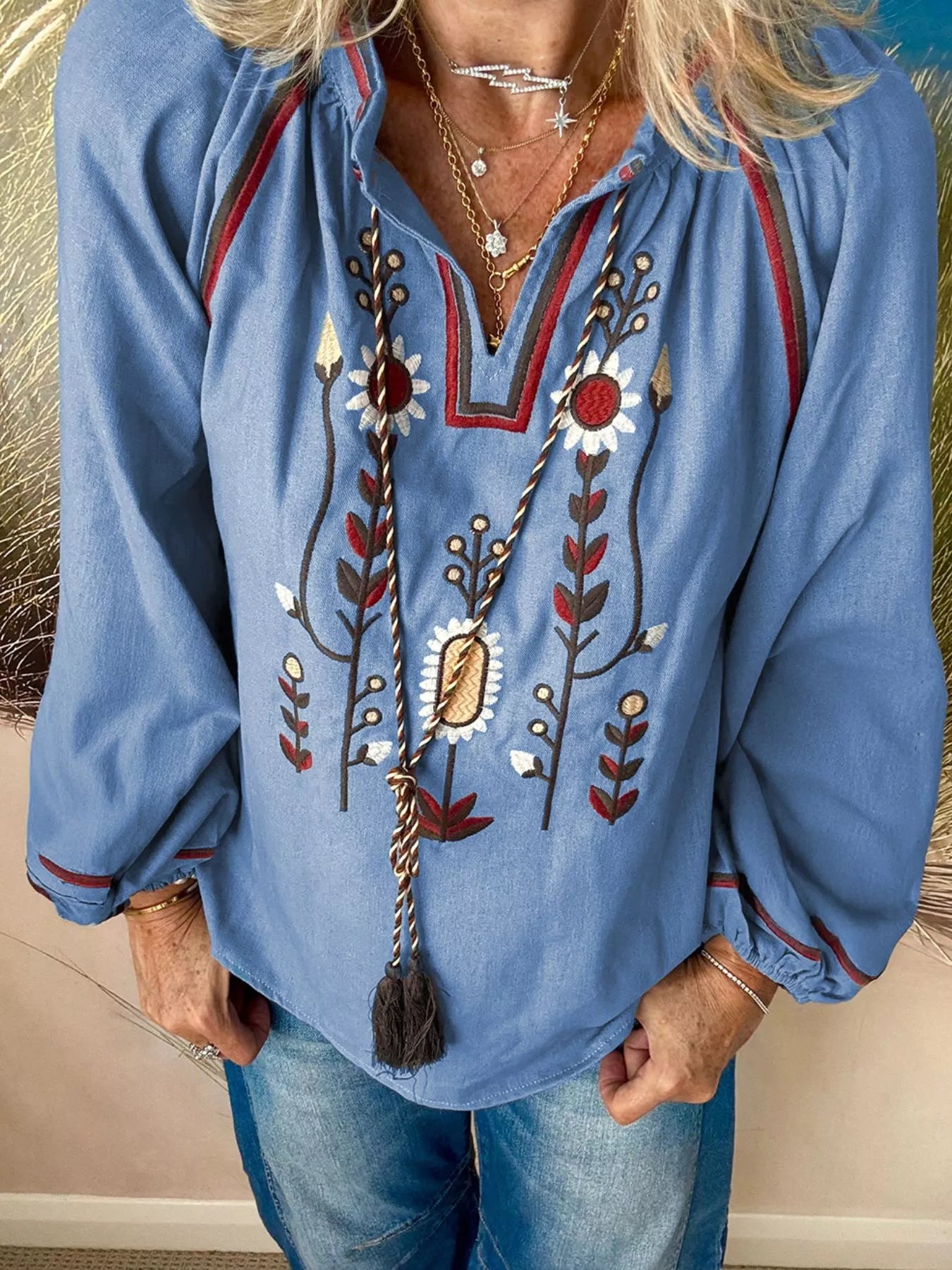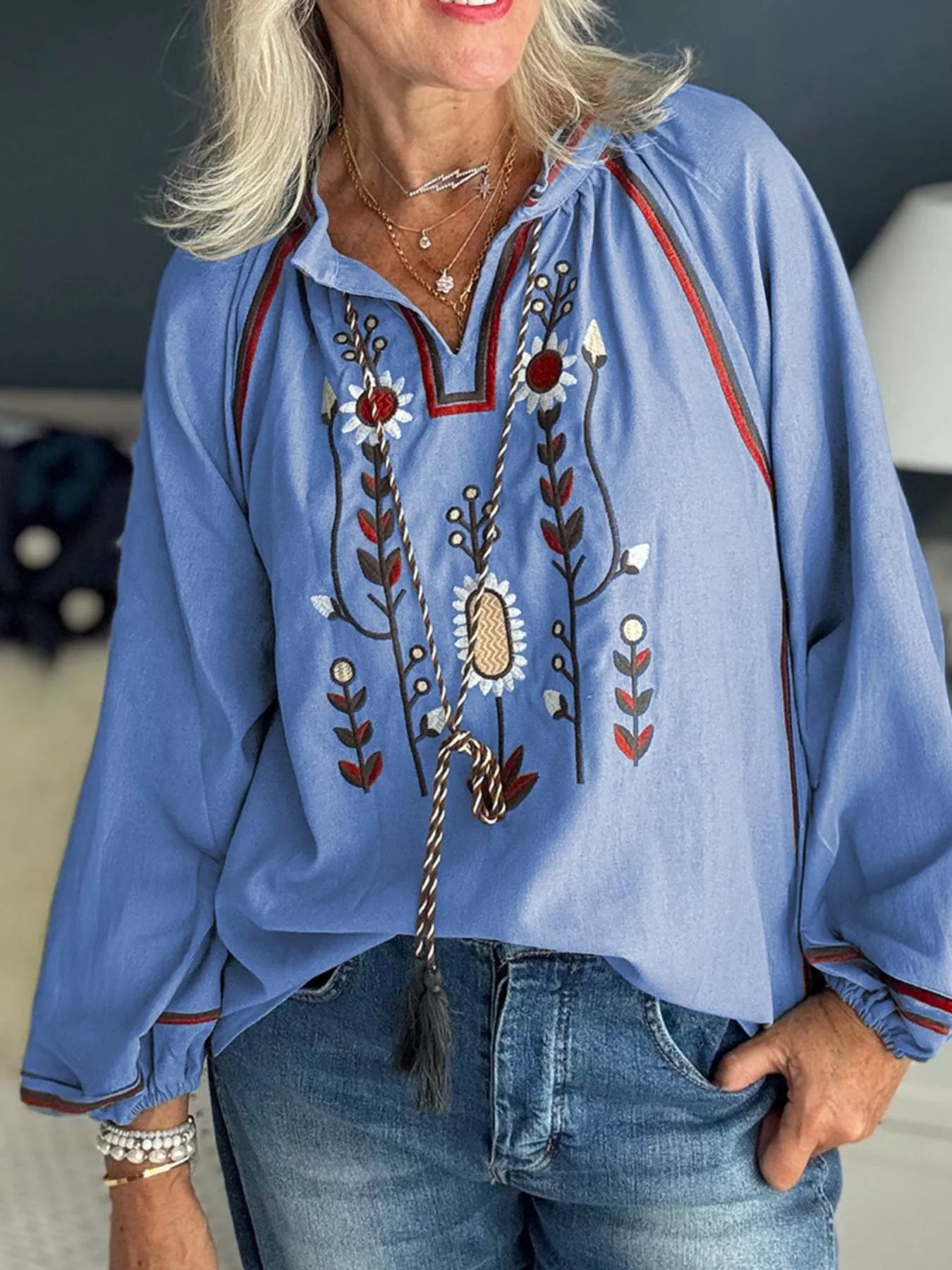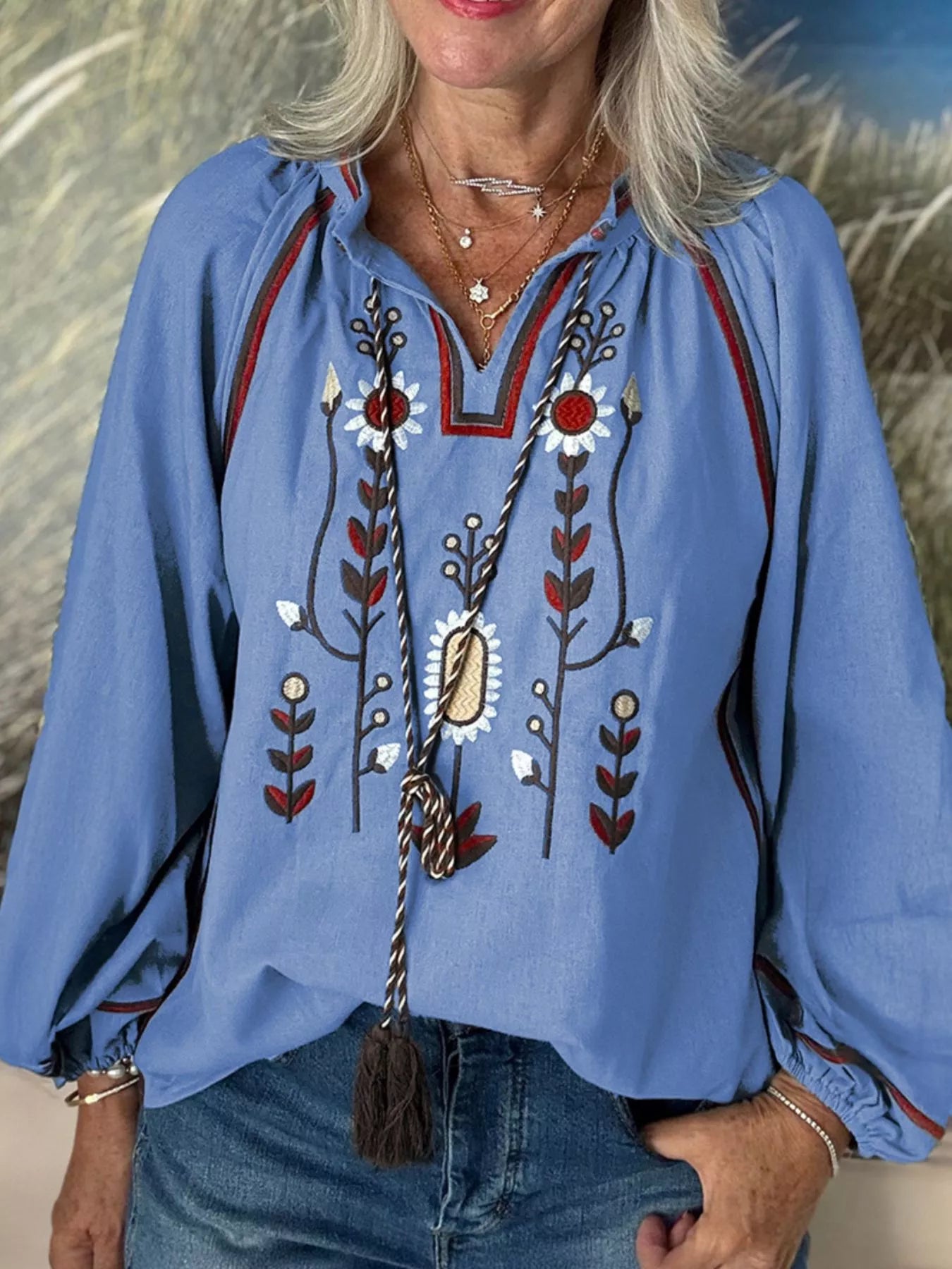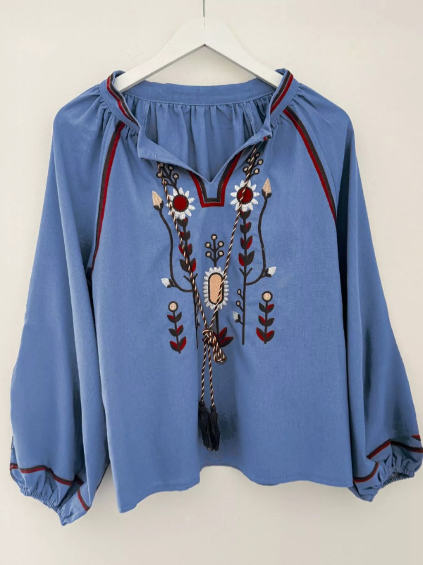 NEWYORKLISTED STYLE COLLECTION: Floral Embroidered Split Neck Tassel Tie Puff Sleeve Blouse