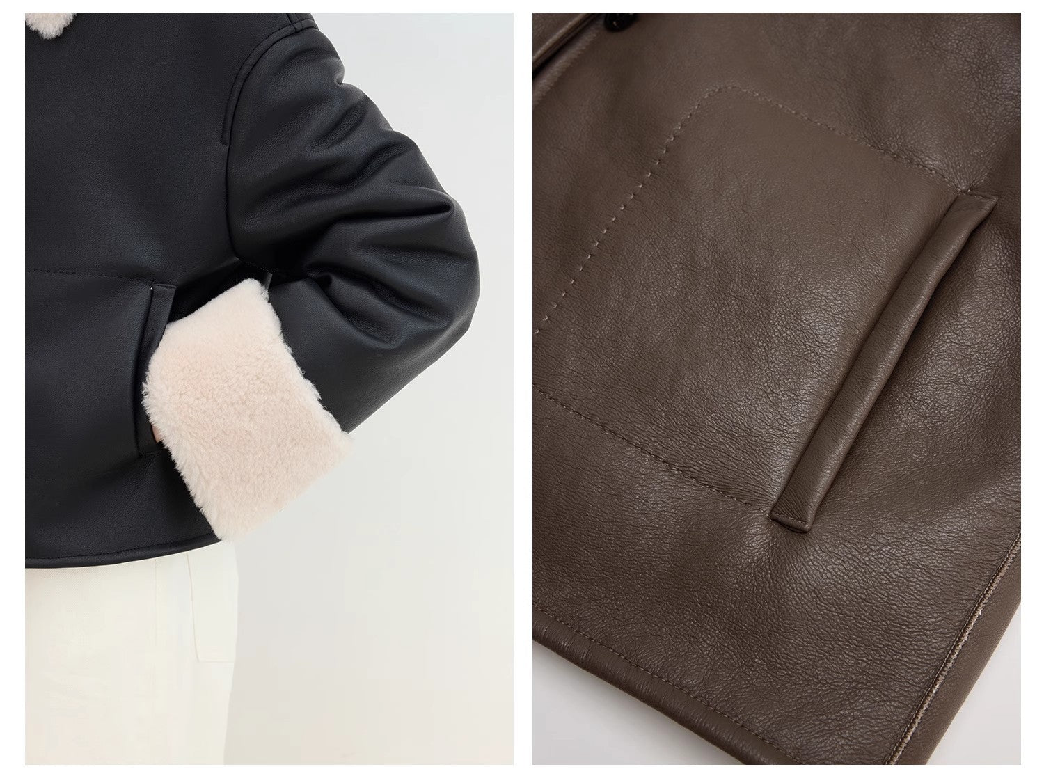 The delicate and thick sheepskin lining is dense and warm, and the genuine leather-like PU leather surface presents a high-end luster. The loose straight fit makes you slim and slim, and the neat short style easily optimizes proportions. Comfortable and versatile, it looks tall and stylish. The contrasting fur lapels are warm and the wide raw edge stitching on the cuffs adds a sense of layering and echoes the details.